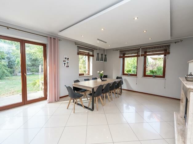 Dom z 2005 roku, więc wymaga odświeżenia, ale wykonany jest z dobrej klasy materiałów: Porotherm, docieplony wełną mineralną, okna trzyszybowe drewniane, kominek otoczony marmurem, reprezentacyjne, drewniane schody, dobrze wyposażona kuchnia (sprzęty firmy Bosh), na piętrze podłogi drewniane - dębowe.
